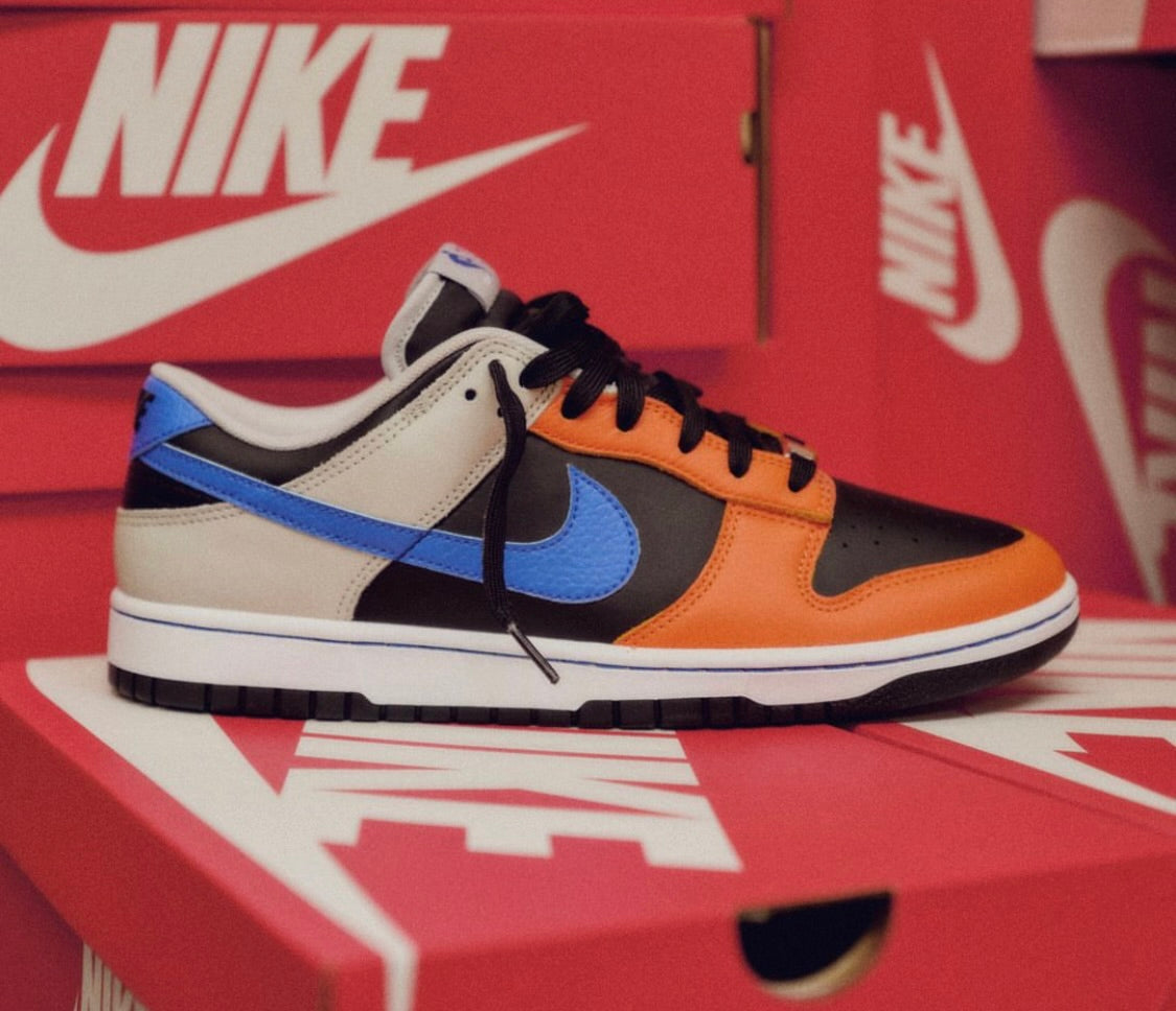 Designed to pay homage to the New York Knicks, this variation includes the team shades of orange and blue, offset by additions of black, grey and white. The blue is showcased on the swoosh, while the orange is included on the side panelling and the eyelet. Orange and blue truly pops against the panels of black leather.