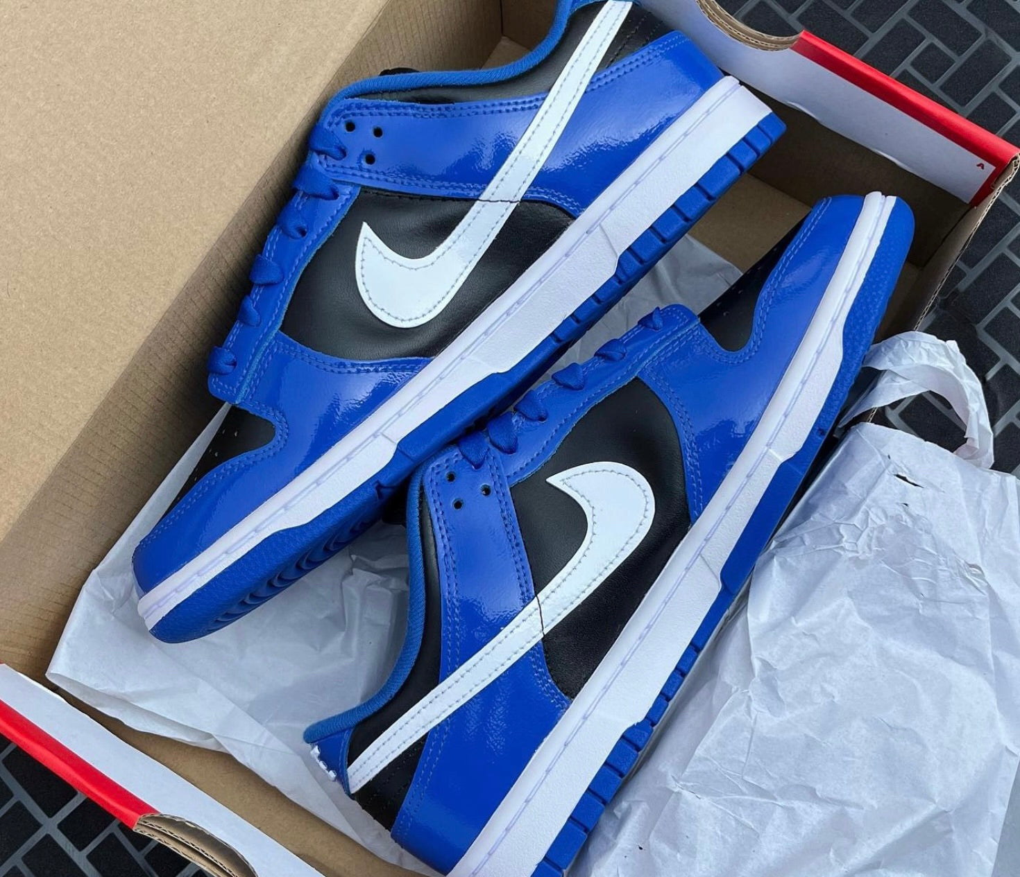 Crafted with leather, the Dunk Low 'Game Royal' offers a stark black base, complemented by blue overlays and a white swoosh. Nike detailing can be found on the tongue tag, embroidered heel logo and grey-printed insoles. It rests on a matching white midsole and blue outsole, with blue laces for a clean finish.