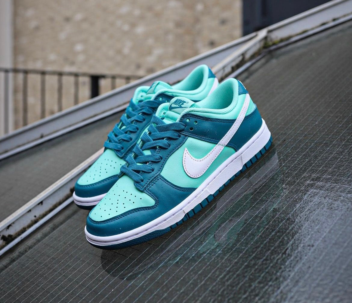 The Dunk Low 'Geode Teal' is dressed in a white and emerald colour scheme with a leather upper paired with mesh on the tongue and lining. It features a turquoise base, contrasted by teal accents on the overlays, laces, heels, insoles, and outsole. Finishing details include white on the swoosh, heel, insole branding and midsole.