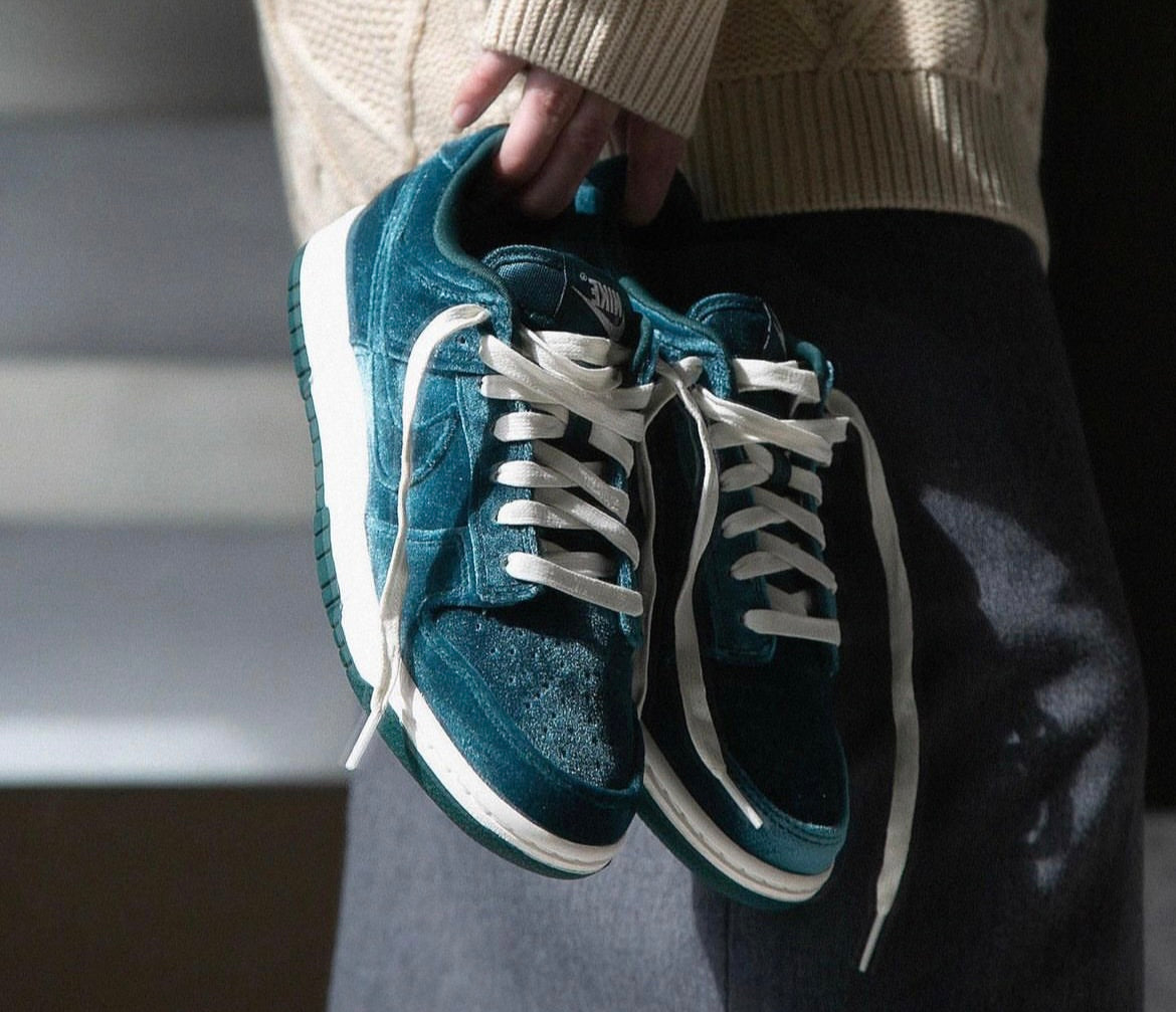 The Dunk Low 'Green Velvet' treats its silhouette to a sumptuous makeover. The upper is a plush velvet in a lustrous teal hue. It's appointed with heritage details, including a perforated toe box, a padded collar, and a nylon tongue. Mounted on a traditional cupsole, it features vintage off-white sidewalls and a dark teal outsole.