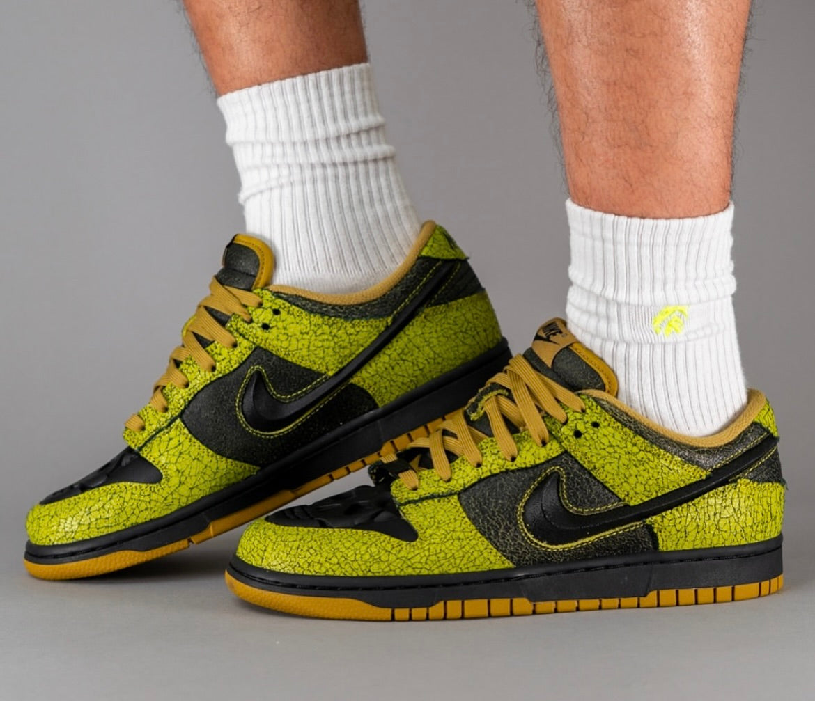 The Dunk Low 'Haloween Skull' features a cracked leather upper, with a black base and contrasting green overlays at the forefoot and heel. A molded black swoosh sweeps across the side panel, while an embossed skull graphic decorates the toe box. Inside, additional skull imagery adorns the custom sockliner. It rests on a solid black midsole.