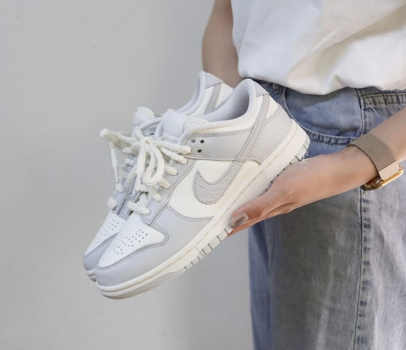 The Dunk Low ‘Needlework’ showcases neutral tones and unique details. Braided rope laces secure the upper, featuring a subtle off-white base with grey overlays at the forefoot and heel. An intricately embossed pattern enlivens the swoosh, while a single rhinestone is embedded on the heel, marked with Nike branding.