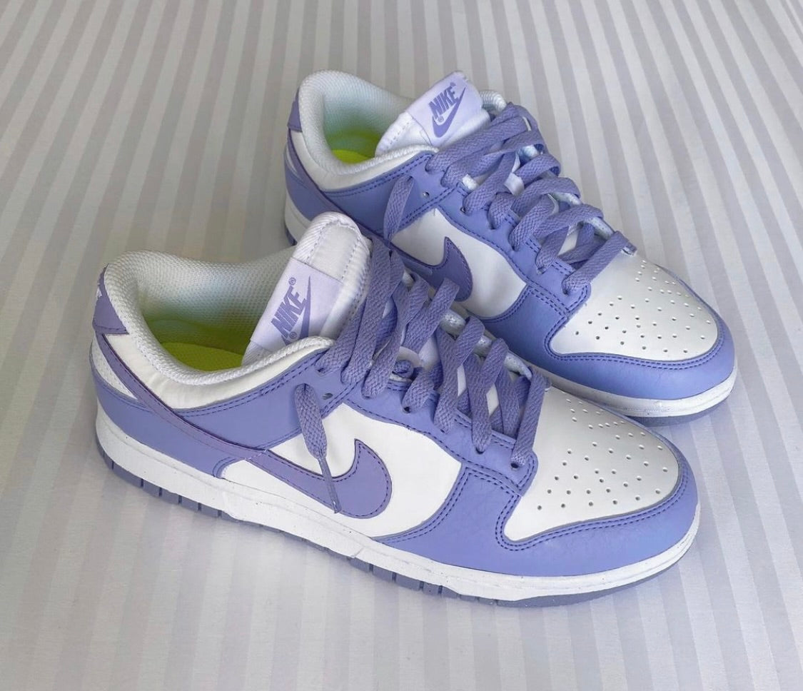 The Dunk Low 'Lilac', made from 20% recycled materials, features a white base and completed with a perforated toe box for ventilation. Pastel lilac pebbled leather overlays and a tonal swoosh decorates the upper. Matching light purple branding on the tongue label is complemented by the embroidered Nike lettering on the heel tab.