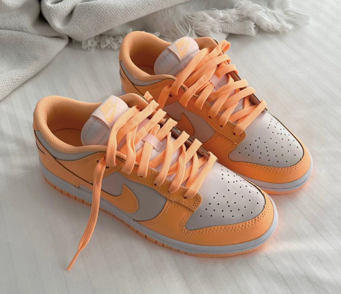 The Dunk Low ‘Peach Cream’ strikes a balance between the neutral and the radiant. Smooth leather is utilised on the upper, merging a light grey foundation with orange overlays. The colour blocking is accompanied by heritage details, including a perforated toe box, a breathable nylon tongue, and durable cupsole tooling.