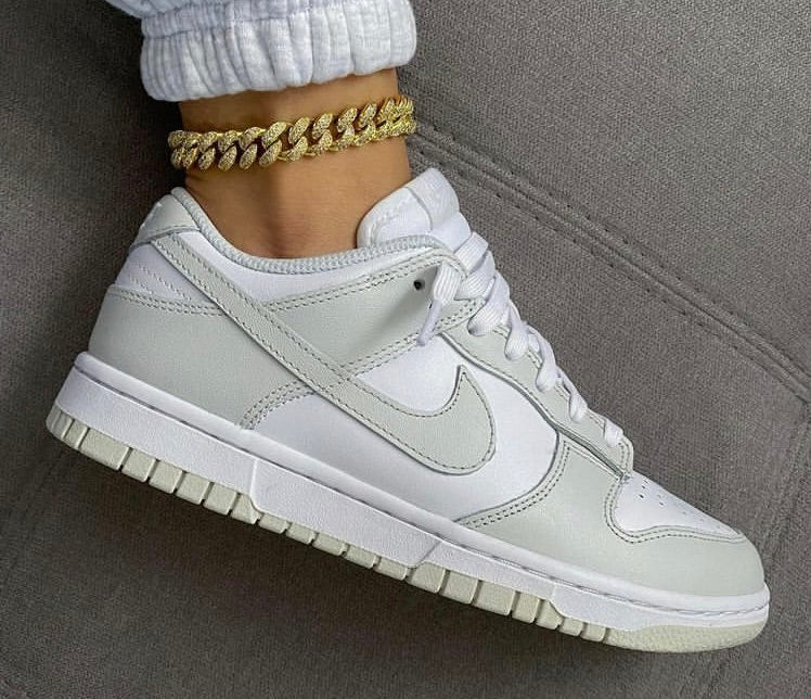 The Dunk Low 'Photon Dust' brings a subdued look to its classic construction. The upper appears with a white base, complemented by grey overlays. The toe box includes perforations for breathability, while underfoot, the two-tone look continues onto the rubber cupsole, which includes a concentric outsole for traction.