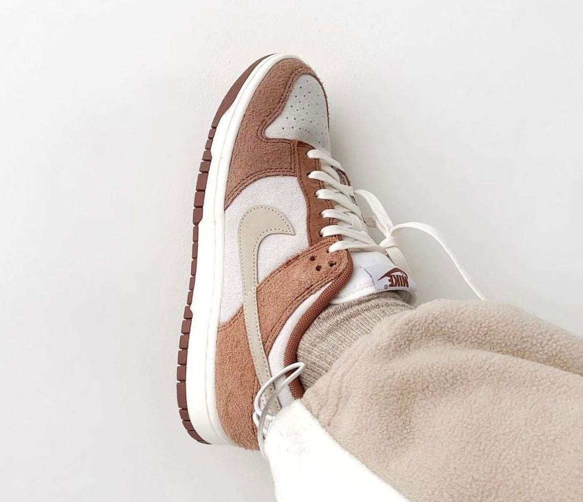 The Dunk Low ‘Medium Curry’ features a suede upper in warm, autumnal hues. A cream-hued base is contrasted by curry brown overlays at the toe and heel, while fossil colouring is applied to the swoosh and heel. It rides on a rubber cupsole, featuring a grippy traction pattern virtually identical to another mid ‘80s hoops shoe, the AJ1.