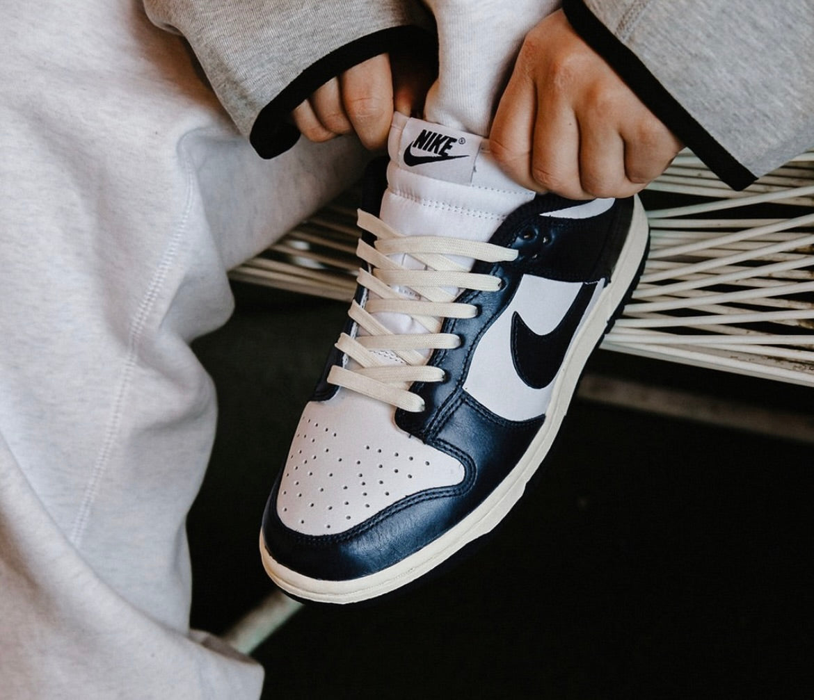 The Dunk Low ‘Vintage Navy’ features a two-tone palette that channels the original ‘Be True to Your School’ series from '85. It sports a white leather upper, accented with Midnight Navy overlays and a matched swoosh. Its mounted on durable cupsole tooling, highlighted by aged sidewalls in coconut and a grippy rubber outsole.