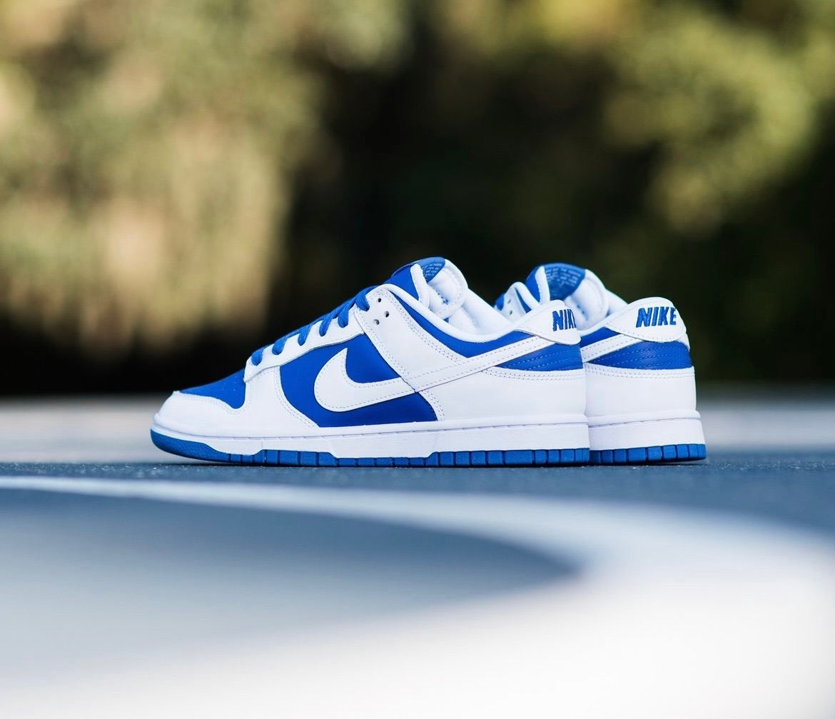 The Dunk Low ‘White Racer Blue’ showcases a simplistic two-tone palette. The upper is in smooth leather, highlighted by a marine blue base with contrasting white overlays at the forefoot and heel. Perforated detailing on the toe box offers improved breathability, while a plush nylon tongue delivers a comfortable fit.