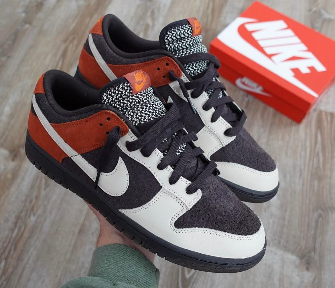 The Dunk Low ‘Red Panda’ spotlights a distinctive palette inspired by the elusive Himalayan mammal. The upper features a suede base in a Velvet Brown hue, contrasted by forefoot and heel overlays in sanddrift leather and orange suede. Atop the patterned textile tongue, a woven tag displays Nike branding in Campfire Orange.