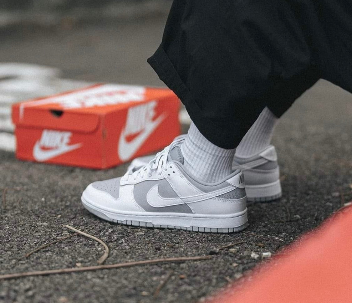 Maintaining its iconic look, the Dunk Low 'Grey White' is constructed on a rubber cupsole with sidewall stitching and foam wedge for easy wear. The upper in grey tumbled leather joins white overlays accompanied by the signature swoosh, also in stark white. The tongue tag, sockliner and back tab all deliver Nike branding.