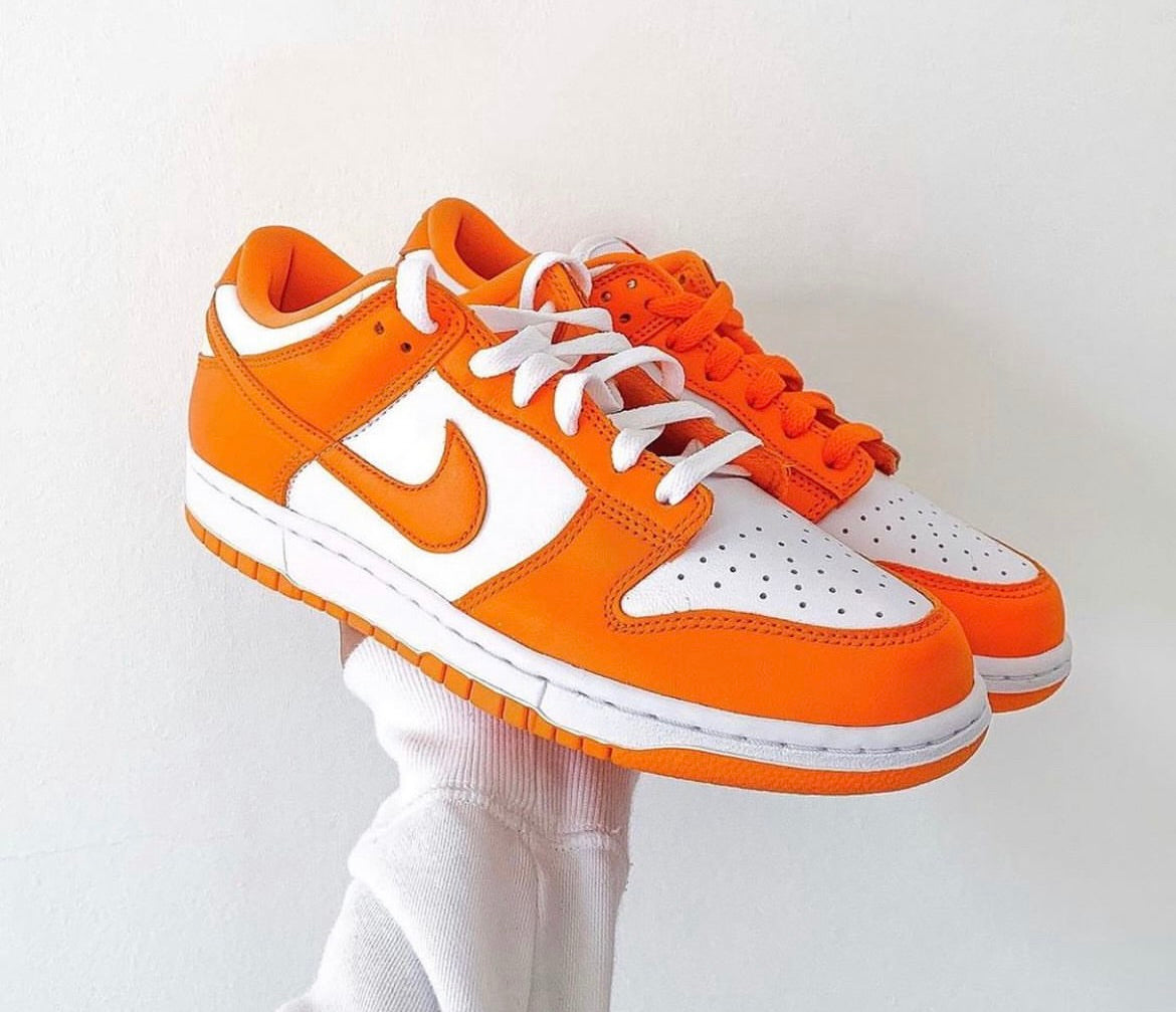 Celebrating the 35th anniversary of the silhouette, the Dunk Low 'Syracuse' gives the nod to Syracuse University basketball team with its white and orange blaze hue. Perforations on the toe box provide breathability, while zoom air in the sockliner provides cushioning. The sole unit underfoot continues the two-tone look.