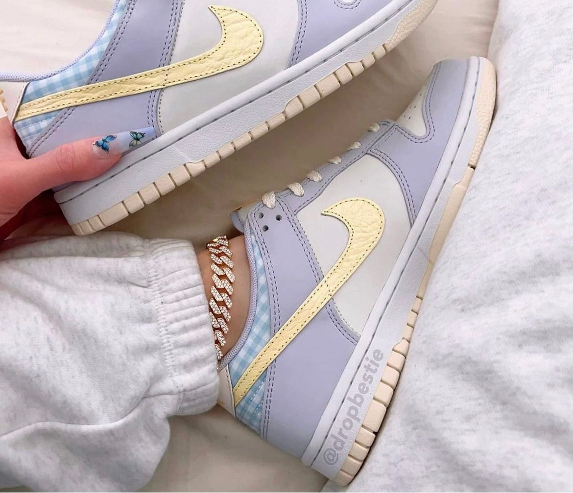 The Dunk Low ‘Easter’ spotlights a warm-weather palette made up of pastel hues. The upper combines a off-white foundation with soft lavender overlays and a textured yellow swoosh. A blue pattern is on the collar and the sneaker is anchored by a durable cupsole that pairs white sidewalls with a pale yellow rubber outsole.