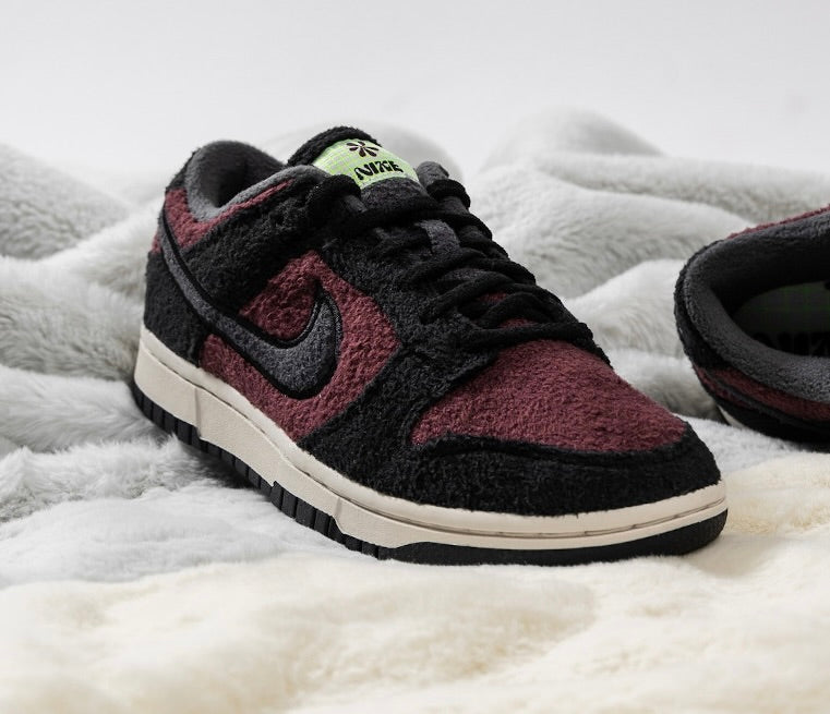 Plush details distinguish the Dunk Low SE 'Burgundy Crush'. Cozy fleece replaces leather on the black-and-burgundy upper, with the swoosh, tongue and lining of the collar contrasting in dark smoke grey. The midsole is delivered in an aged off-white atop a black rubber outsole. Nike branding adorns the tongue tag and back heel.