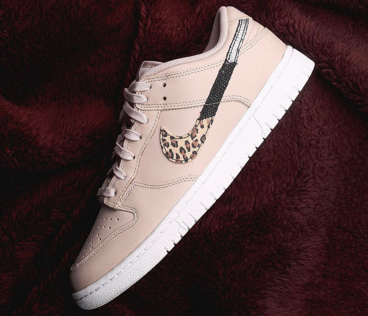 Featuring a segmented swoosh that combines animal prints with a silver finish, is the Dunk Low 'Primal Pink'. Its branding element pops against a muted pink leather backdrop with perforated detailing on the toe box and a Nike wordmark on the heel tab. Underneath is a white rubber cupsole with an outsole pattern.