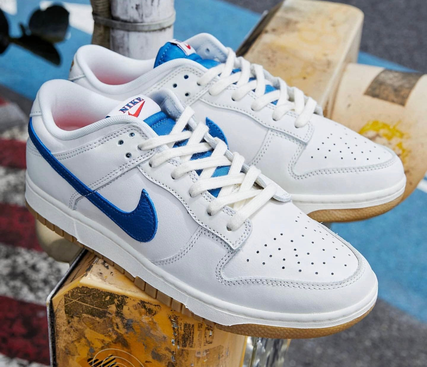 Showcasing a new colourway is the Dunk Low 'Marina Blue'. Its draped in a two-tone finish of white and blue and flaunts a clean upper, punctuated with blue tone on the tongue and swoosh. A U.S. currency-like branded font is prominent on the heel tab, insoles, and tongues, while a sail midsole and gum outsole rounds out the pair.