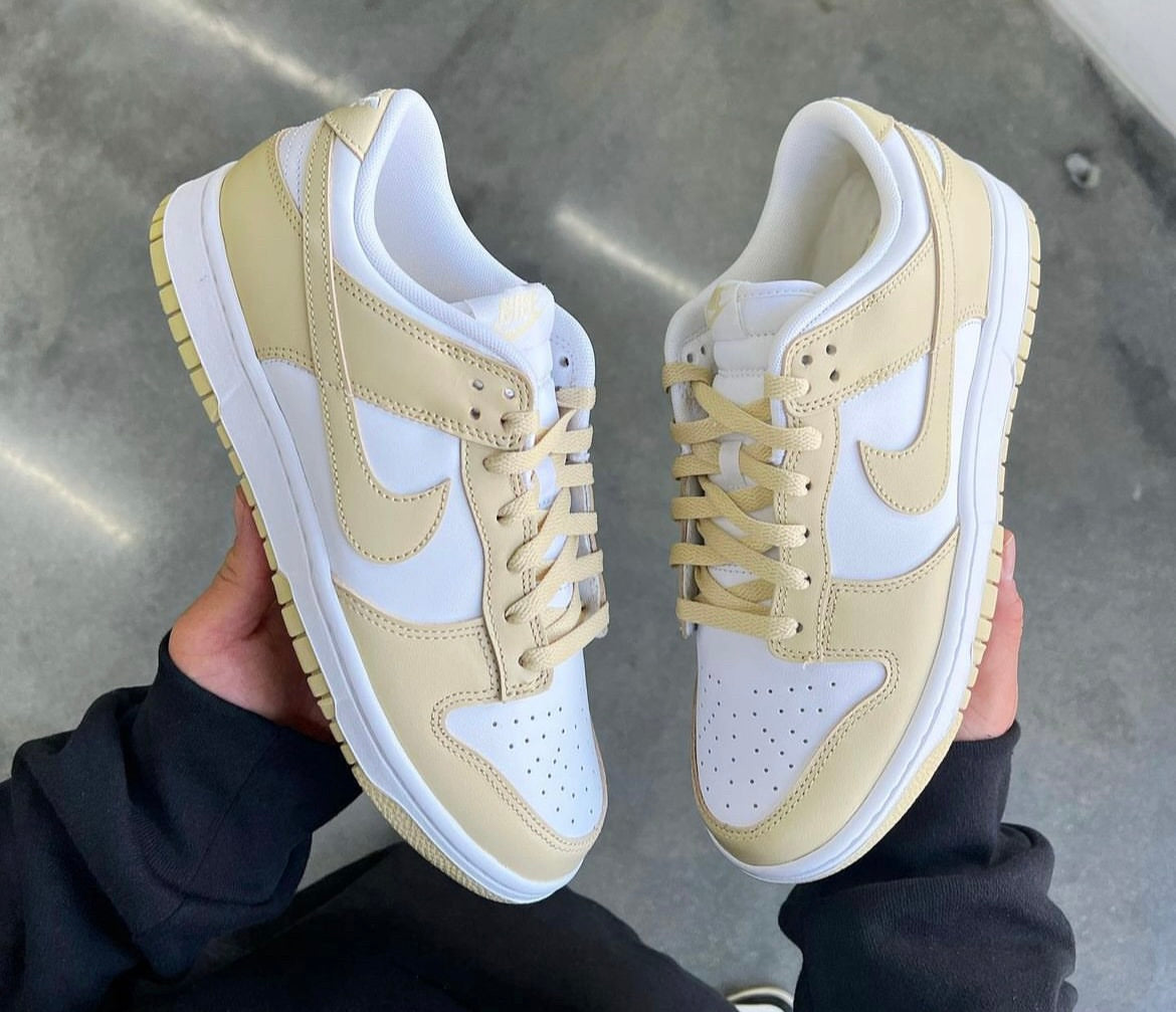 Delivering a two-tone colourway is the Dunk Low 'Team Gold'. Set atop a white leather upper, the pair’s titular tan hue is worked in across the overlays, as well as the laces and outsole tongue branding. Everything else arrives in white, with nylon tongues, liners, and midsoles rounding out the design in striking bright hues.