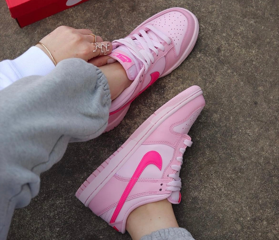 Packed with personality, the Dunk Low 'Triple Pink' has eye-catching elements. Its pink leather base is complete with a perforated toe box and decorated with deep pink overlays. The swoosh and the heel take on a neon pink hue to finish the upper. Tonal Nike branding on the tongue finishes this silhouette’s branded accents.