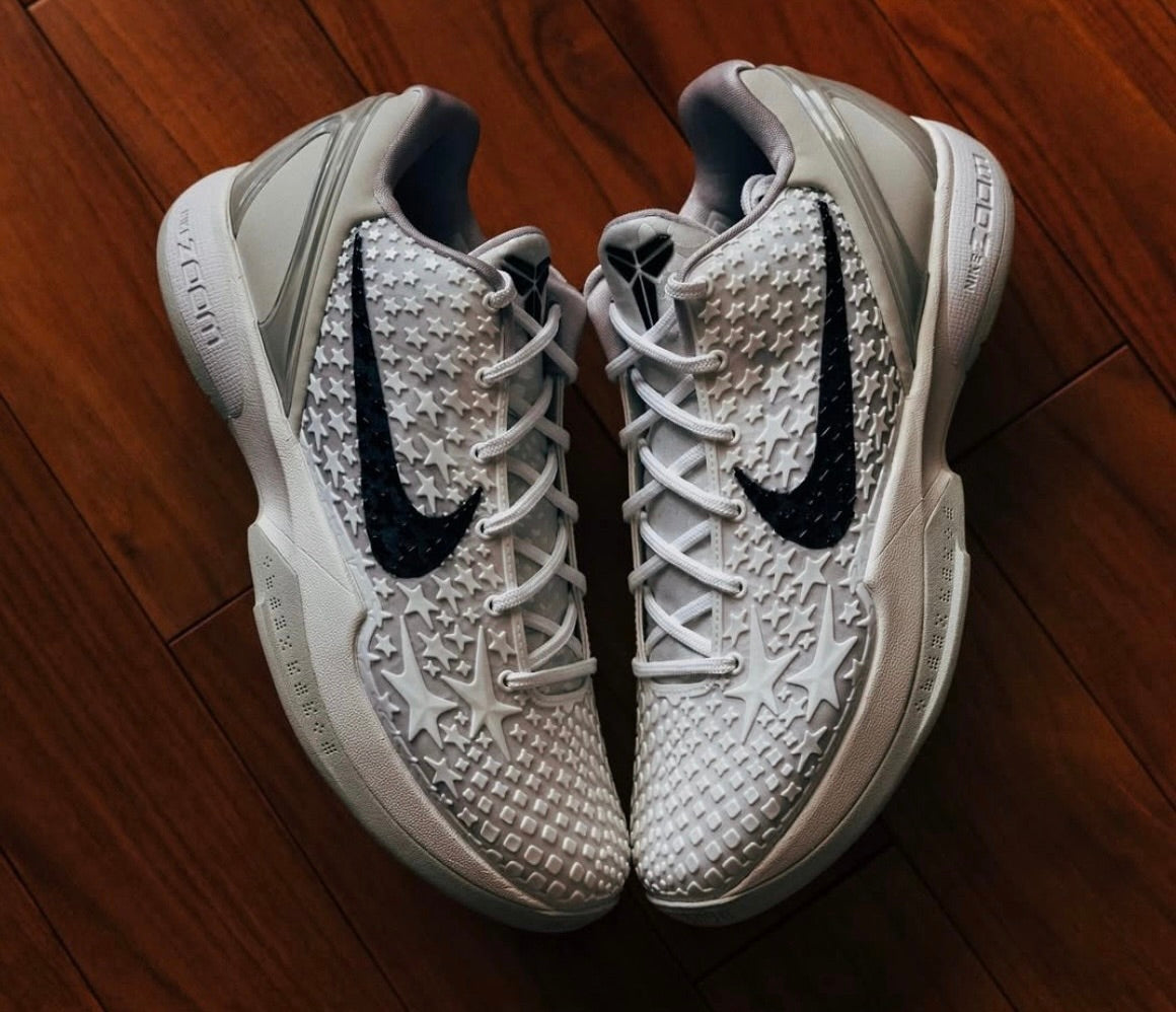 The Kobe 6 'All Star' features an off-white upper covered in stars on the lateral side. The medial side displays a scaly snakeskin pattern for which the Kobe 6 is known. A floating black swoosh adorns the side panel, matching Kobe's signature shield logo on the tongue. It includes a cushlon midsole with a large and flexible zoom unit in the forefoot.
