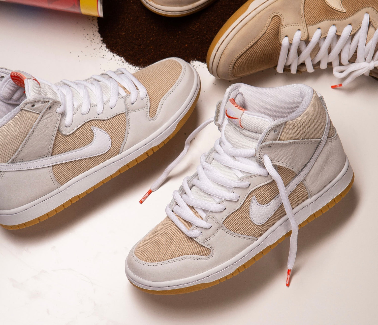 The Dunk High SB 'Unbleached' reveals grey-white leather on the toe, panels, eyestay and heel. This is paired with a beige corduroy fabric on the toe box, along the side panels and collar. White is seen on the swoosh and the laces. For the sole, there is white rubber mid and a gum orange rubber outer sole to finish the warm look.