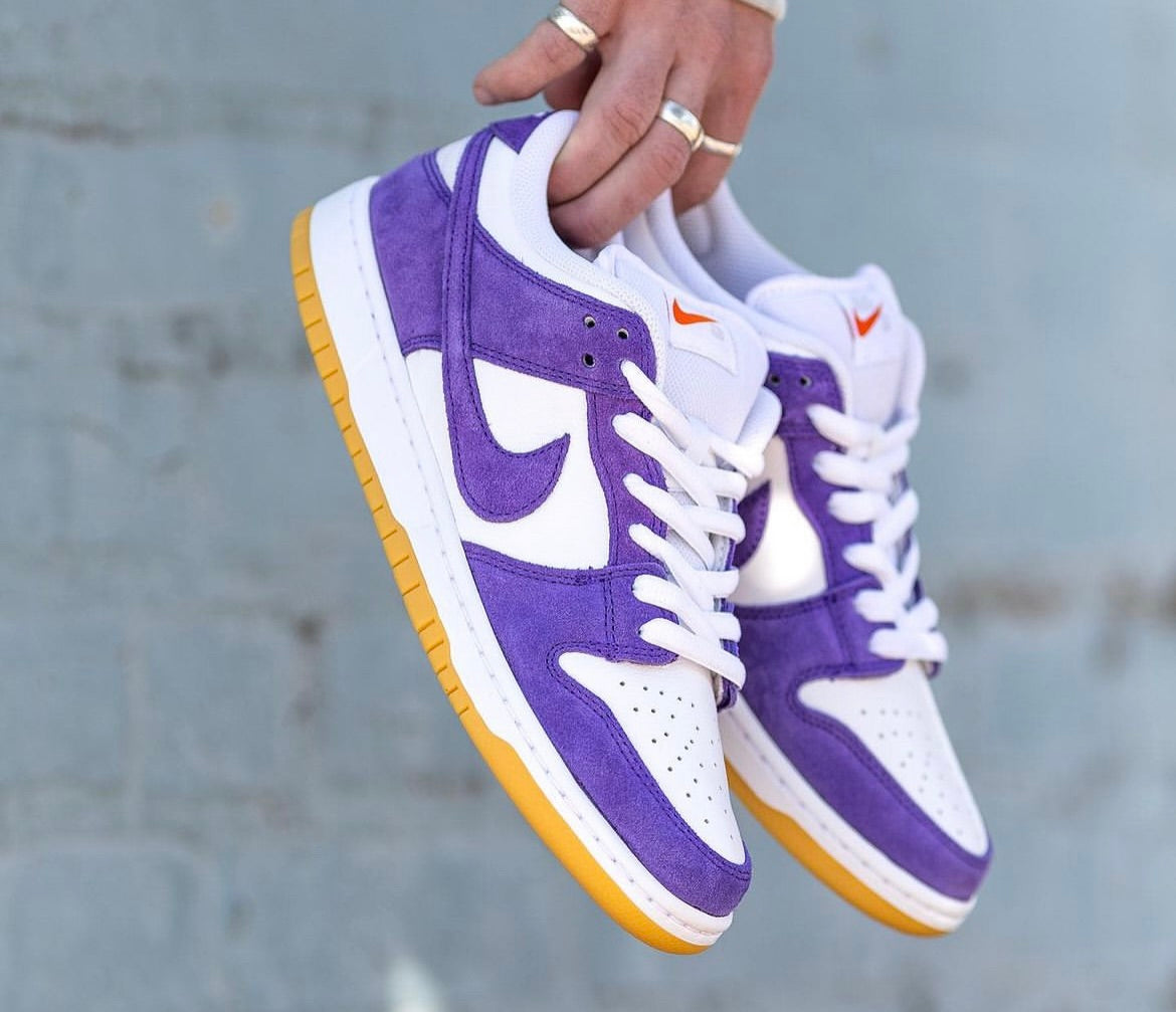 The SB Dunk 'Purple Suede' features a white tumbled leather base layer. Colourless embellishments fill the laces, tightly knit mesh tongue and sock liner, while orange swooshes are along the tongue tabs. Overlays in smooth suede, vibrant purple hues inject a titular personality, while underfoot is the widely-adorned gum tread.