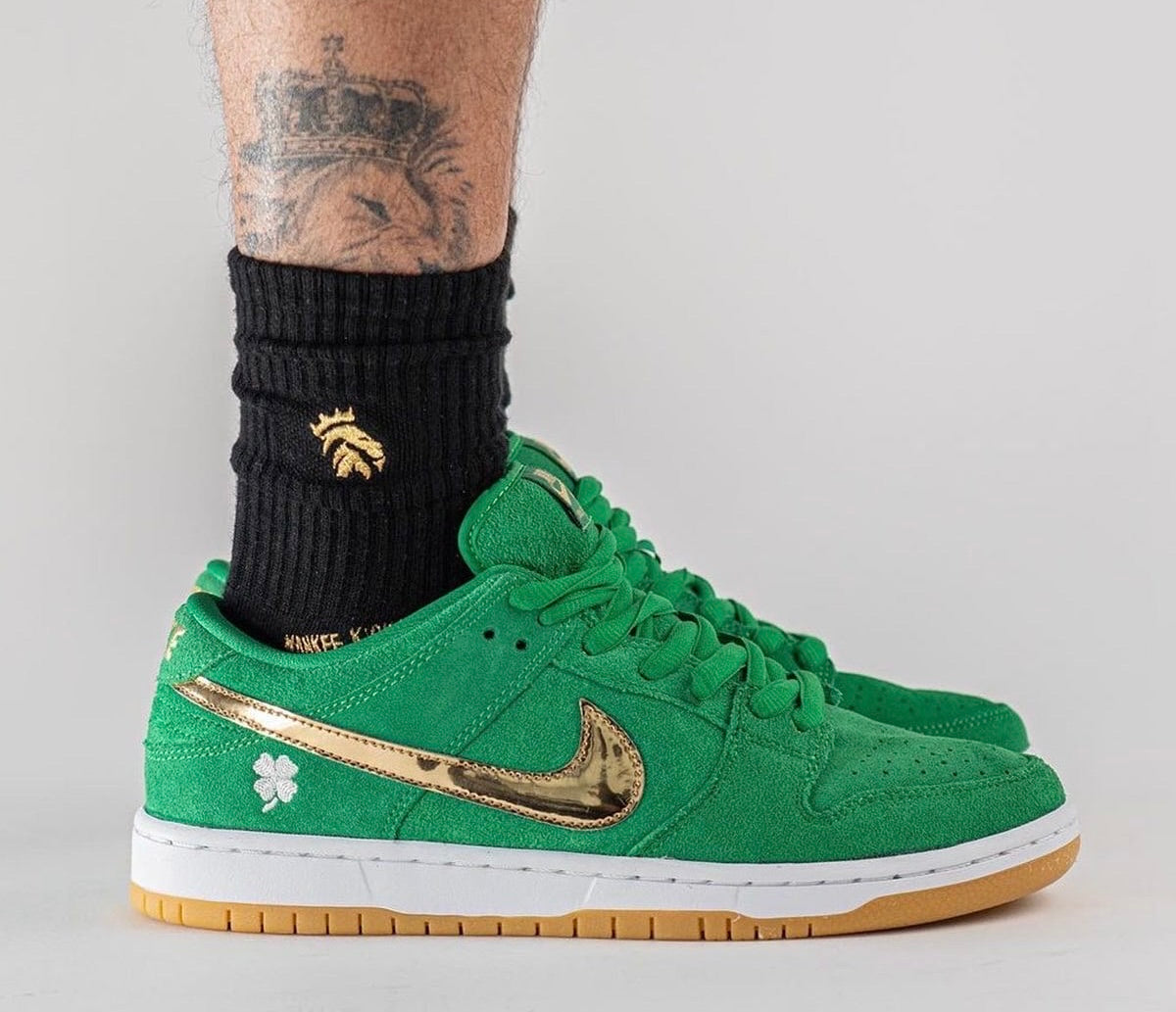 The SB Dunk ‘St. Patrick’s Day’ celebrates 17/03 with a suede upper in green. It’s one-note finish is disrupted by a gold swoosh and a white four-leaf clover embroidered on the heel. Additional gilded accents are applied to the branding atop the tongue and heel tab. Its mounted on a rubber cupsole, with white sidewalls and a gum outsole.