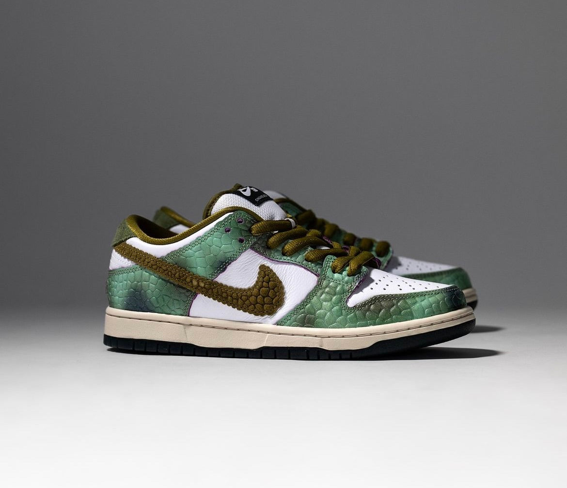 The SB Dunk x Alexis Sablone 'Chameleon' is inspired by a chameleon's colour-shifting skin tone. The leather upper features a crisp white base with a moss green swoosh in a bumpy reptilian texture. The scaly design is also applied to the forefoot and heel overlay, covered in a top layer in green shades that wears away to reveal vibrant fuchsia hues.