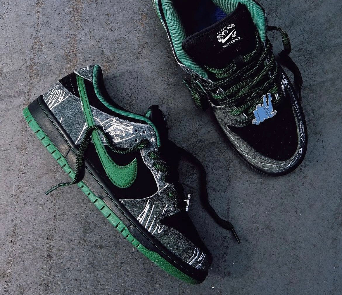 The SB Dunk x THERE Skateboards 'Ultra Humanized' is dressed in black suede, with grey hairy suede overlays covered in original artwork by Jeff Cheung, the co-founder of THERE Skateboards. Green accents land on the swoosh and textile collar lining. Branding decorates the tongue tag and back tab, while lace jewels shine in a metallic silver finish.