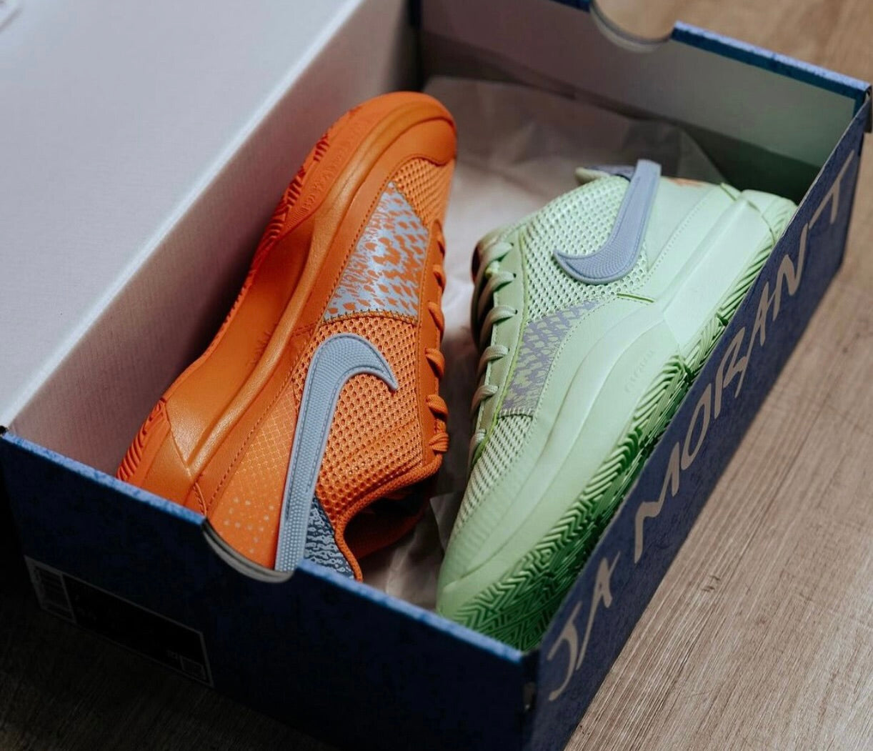 The Nike Ja 1 'Mismatched' is designed by Ja Morant, with colour schemes that mirror each other instead of matching. It features a breathable mesh upper overlaid by support panels around the forefoot. The swoosh hits the midsoles in a textured silver material, while the heel collar is silver with the number '12' embroidered onto it in a shiny silver hue.
