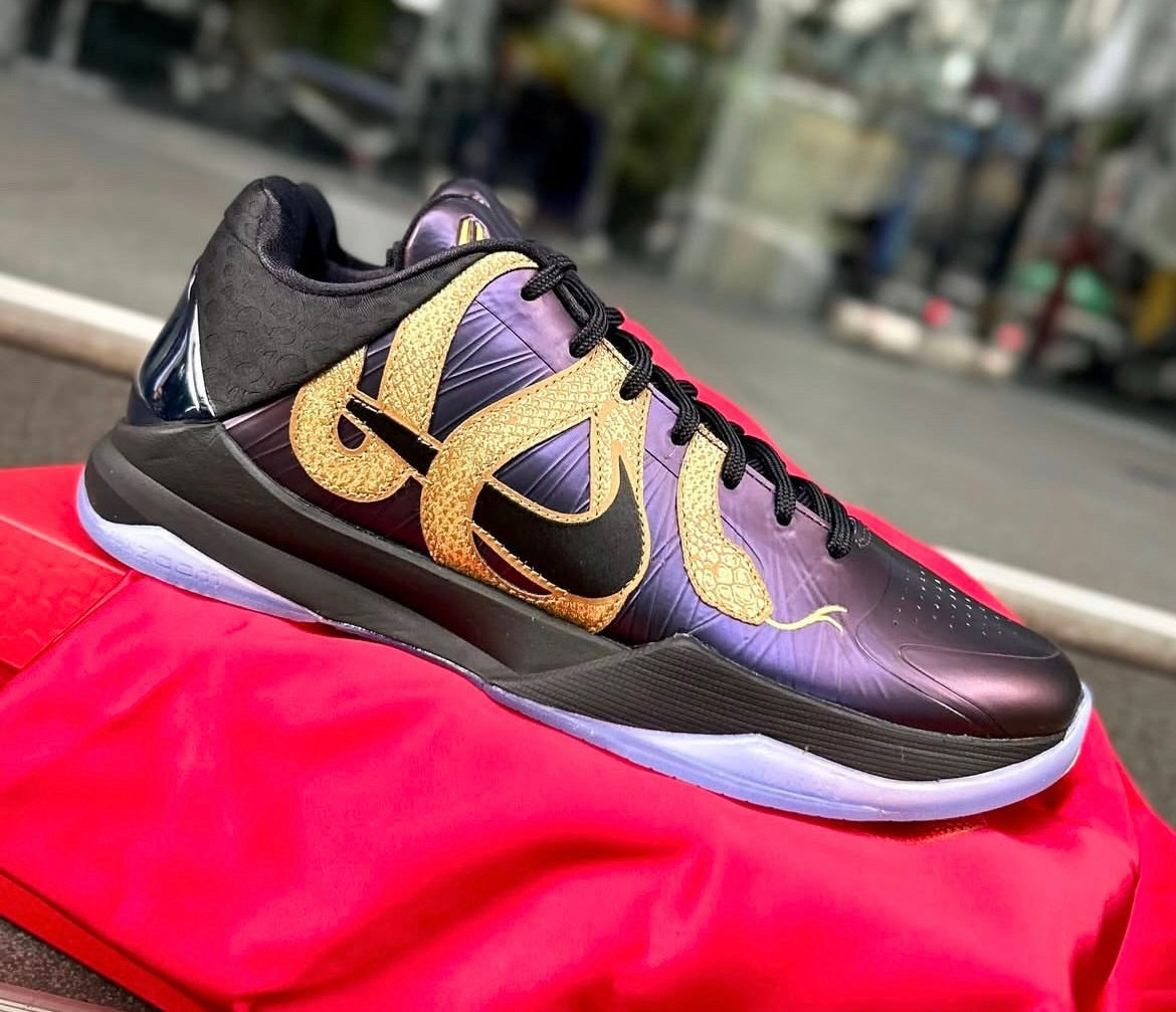 The Kobe 5 Protro 'Year of the Mamba' rings in the Lunar New Year with a nod to the year of the snake. The seamless synthetic upper features a purple iridescent finish with a golden serpent graphic wrapped around the swoosh. Flywire cables act like synthetic tendons to provide a locked-in fit, while the heel counter cradles the back of the foot.